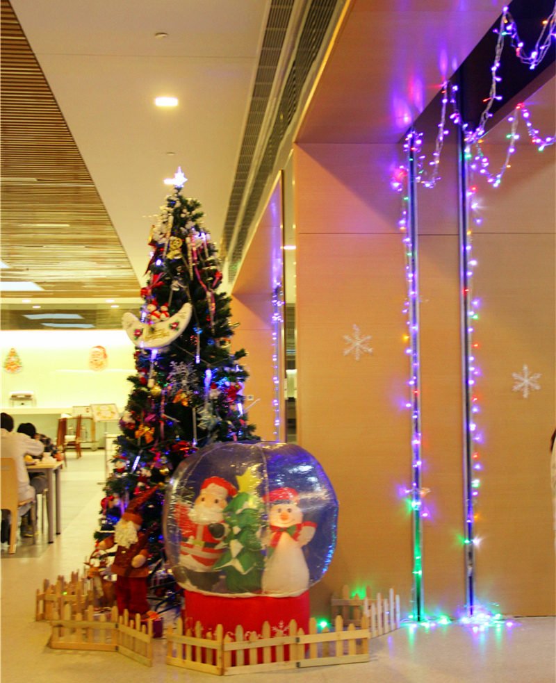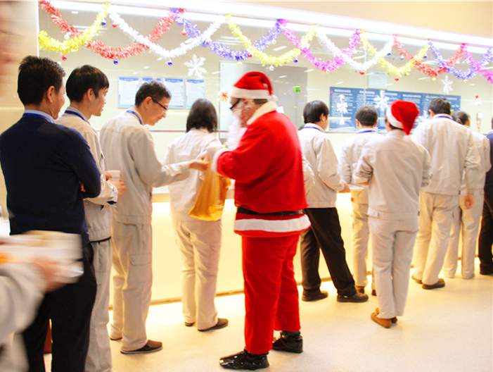 It started at noon, there were plenty of delicious food displayed in the Staff Canteen, included sushi, vegetable and fruit salad, pasta, fried chicken, desserts, Chinese dishes and etc. The classical Christmas music was played and the happy moments of people celebrated Christmas all around the world were displayed on the TV. People enjoyed themselves, they chose what they like to eat, and took picture with our Santa.