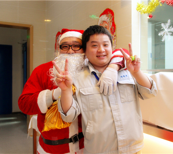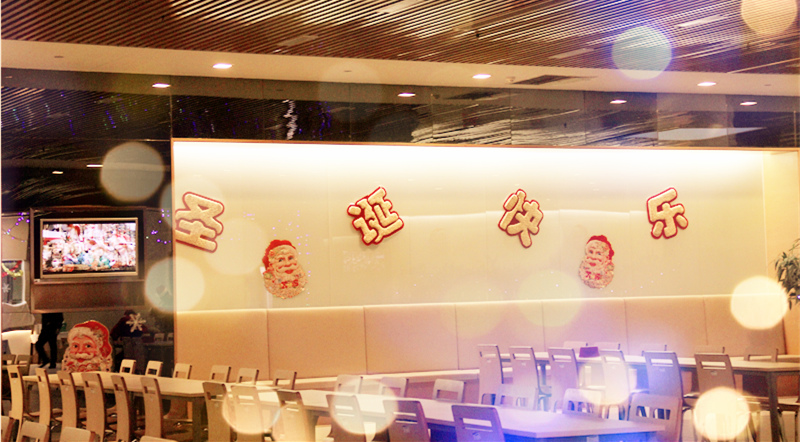 12月25日中午,行政办公室将员工餐厅精心布置了一番。餐厅里挂满了闪亮的灯,墙壁上也应景的贴上了圣诞快乐的祝福语,电视上播着世界各地欢庆圣诞节的幸福画面,耳边回荡着充满节日氛围的欢快音乐。