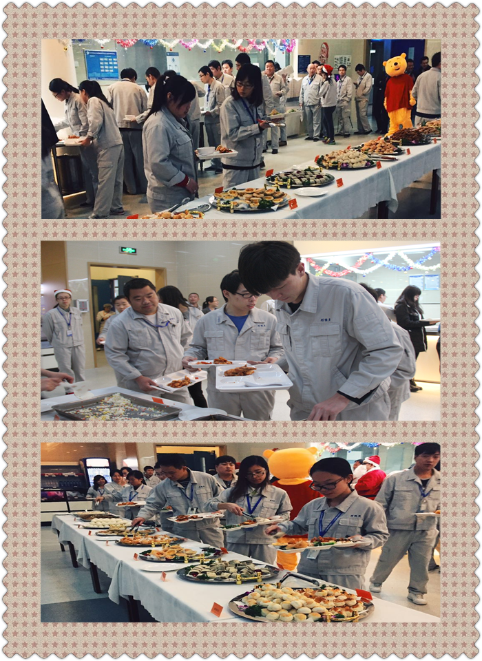 12月25日中午,餐厅里挂满了闪亮的灯,竖起了美丽的圣诞树,电视上播着各个部门为圣诞节而拍摄的集体照,耳边回荡着充满节日氛围的欢快音乐。点餐的窗口改造成了自助取餐的餐台。京味点心,西式糕点,日式菜肴,意式面点,水果沙拉、蔬菜沙拉等应有尽有,所有食物供员工自由选择,且所有食物均无限量供应。